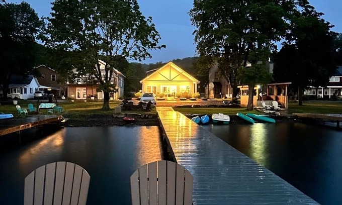 Relax with your morning coffee ,evening cocktail , or your favorite meal on the perfectly set up covered porch overlooking the lake. See the breathtaking Seneca Lake Sunsets in the evening. Walk a few steps to your private dock to soak up the sun, take a swim, fish, or just enjoy the view. Included in your rental enjoy ready to use kayaks, paddle board, and a paddle boat. At night sit around the fire pit on the beach and tell your tale of the day! This is a lake level property with no stairs inside or out.