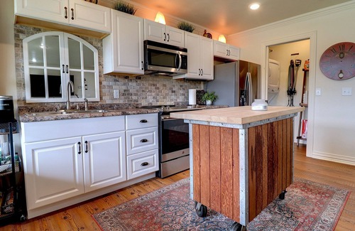 The upstairs of the home includes one bedroom with a queen-sized bed and a second bedroom with two twin-sized beds. The bathroom has an easily accessible, large walk-in shower. There is also a full-sized washer and dryer that comes with detergent and softener.