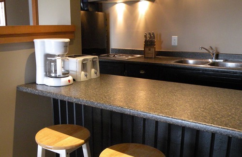The kitchen area is small, but it gets the job done. An apartment-sized fridge, two stove-top range, large toaster oven, toaster, microwave, kettle, coffee-maker and pots/pans and dishes are there to help you prepare basic and more than basic meals. We don’t have an oven, but to make up for it there is BBQ outside. And of course, we wouldn’t have a vineyard without wine glasses and a decanter to help you enjoy your loot!