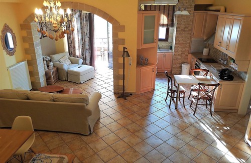 Sandy's home is a beautiful spacious (136 sq. meters) holiday home, located in the center of Kolymvari Village. It's 30 meters away from the beach, and has everything one will need to have a comfort stay. 6 adults will sleep in the large beds, and can also accommodate an infant in a crimb if needed. A large terrace and balconies provide excellent view around. The house is fully equipped with every electric appliance needed in kitchen, bathrooms etc. It's fully air conditioned in all bedrooms and living room, provides free wi-fi internet, and smart tv.