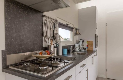 Chalet 39 is suitable for 4 people (55 m2 living space) and includes 2 bedrooms, 1 bathroom and a kitchen with a 4-burner gas stove, combination microwave, fridge with freezer compartment, coffee pad machine, dishwasher and kettle. The bathroom has a walk-in shower, sink and toilet. There is also a separate toilet. The living room has a cozy sitting area, dining area, television, DVD player and sliding doors. The bedrooms are arranged as follows; 1 bedroom with a double bed and 1 bedroom with 2x single bed. Bed making service can be booked! A washing machine, parasol and free internet are available.