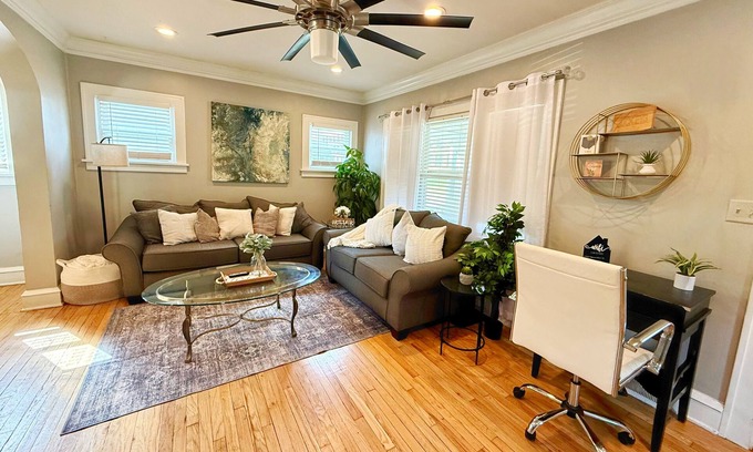 The whole group will enjoy easy access to everything from this centrally located area. A beautiful modern styled home in the heart of Cleveland. Within 10 minutes of downtown Cle, Ohio City, Cleveland Clinic, UH, Zoo, The Flats & more! Local grocery stores, restaurants, bars, & shopping center within walking distance. Enjoy a home away from home in this cozy, stylish, & spacious home that has an enclosed privacy fence, two porches, a bar, an office, a basement & living room entertainment center.