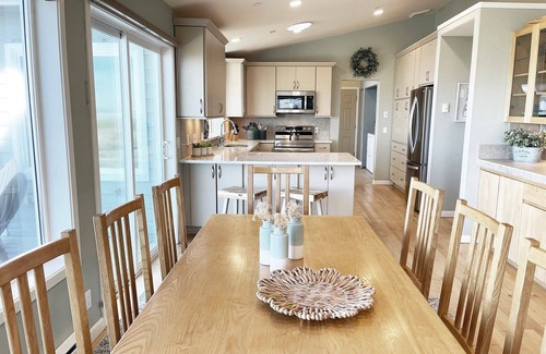 The brightly lit living area is open to the kitchen and dining room and is great for friends and family to enjoy time together. Open the sliding glass door and enjoy the outdoors with your favorite beverage while watching the sun sink beyond the western horizon. Ready to grill up your favorite seafood? The gas grill is ready to use! Another spacious living area is available for those who might want to sneak in a bit of remote work. With built in desks, chairs, sofas, and a television there is plenty of space for everyone! Two bedrooms with their own ensuite bath await you after a day of exploring the beach. Just a short walk is the beach access; it's your gateway to the sand, surf, shell collecting, agate hunting and kite flying!
