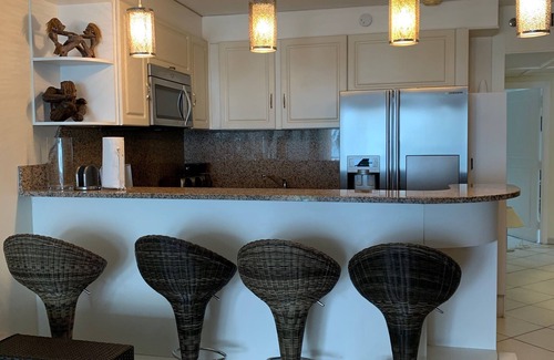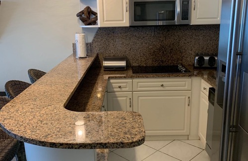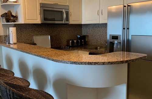 The suite includes a luxurious marble bathroom with a garden tub, and a fully equipped kitchen featuring granite countertops, a breakfast bar, stovetop, side-by-side refrigerator, dishwasher, and microwave. The unit also comes stocked with kitchen essentials and includes two 40-inch Smart TVs for your entertainment.