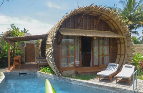 The villa is centered around a stunning pool lagoon that acts as an oasis on a hot tropical day. The garden and stone pathways will lead you to the beautifully-design villas. The house has a unique facade of a circular shape made of bamboo. The rest of the structures are also dominated by natural materials, like wood, bamboo, and stone. The rooms are spacious and open, allowing you to enjoy nature at its finest.