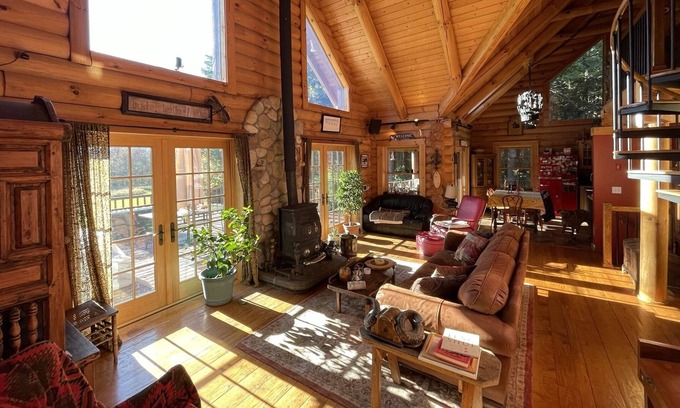 This custom built log home sits on 100+acres of private family owned mountain forest at an elevation of 2000 feet. You will have the ultimate in privacy while still enjoying fantastic mountain views from the spectacular sun deck. This is not generally a rental home as we frequently spend time here both winter and summer. The home will have a warm 'lived in' feeling that reflects what a vacation home is. A recently built barn can be utilized for outdoor summer events. (Inquire for rates etc)