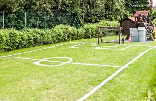 Veselý Kopec is a modern and comfortable detached country house with two stories, situated on the outskirts of Chotěboř, Czech Republic. This holiday rental offers a tranquil and sunny position, just 600 meters away from the edge of the forest. The property features a private, fenced area with a lawn, a heated round swimming pool (2.5m diameter, 1.5m depth, available from May 1st to September 30th), a pergola, terrace, garden furniture, barbecue, and a children's playground with a slide, swing, and sandbox. Additionally, it provides amenities such as an infrared sauna, a trampoline, storage rooms for bicycles and skis, central heating, a washing machine, a tumble dryer, and bicycles available for use.