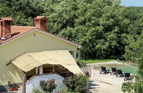 Single-family house "Angelina (LBN428)". In the district of Strmac 4 km from the centre of Labin, 9 km from the centre of Rabac, 9 km from the sea. Private: property 1'300 m2 with lawn and trees, swimming pool (40 m2, depth 135 - 200 cm, seasonal availability: 01.May. - 01.Oct.). Barbecue (slide, swing), pool maintenance by the owner/gardener. In the house: internet access, washing machine. Parking (for 2 cars) on the premises. Supermarket 1 km, pebble beach 9 km, rocky beach 9 km. Marina 9 km. The swimming pool for private use (40 m2, depth 135 - 200 cm, 01.01.-31.12.) is a natural swimming pool with a water depth of 35 cm in some places, which makes it suitable for children.