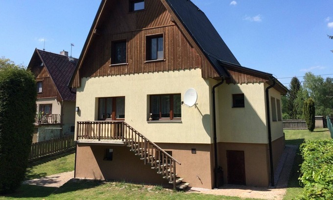 Jestřebice/Dobřeň 3 km from Kokořín: The house is located in the center of the Kokořínsko Protected Landscape Area, an ideal place for rest, hiking, walking in the woods and cycling on marked trails. Child friendly, comfortable house "Jestřebice 7", detached, built in 1978, renovated in 2010. In the resort, in a quiet, sunny position, in the countryside. Private: property 700 m2 (fenced). Outdoor shower, pergola, garden furniture, barbecue, fireplace. In the house: central heating system, washing machine. Parking at the house, single garage. Shop 7 km, supermarket 14 km, restaurant 800 m, bus stop 80 m, railway station 14 km, indoor swimming pool 14 km. Golf course 35 km, tennis 7 km, riding stable 13 km, walking paths from the house 5 m, cycle lane 1 km, children's playground 1 km. Nearby attractions: Jestřebické pokličky 2 km, hrad Kokořín 4 km, skalní města Bludiště, Prolézačky 1 km, hrad Houska 12 km, Mělník 14 km, Mšeno 14 km, hrad Bezděz 23 km. Well-known lakes can easily be reached: Máchovo jezero (Doksy) 25 km. Hiking paths: Kokořínský Důl, Máchova cesta 2 km.