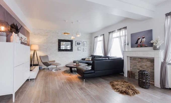 The apartment is located directly at the corner of the Town hall square and the main walking(shopping) street of Akureyri. From the third floor apartment you have a nice Panorama view over the city centre. Whale watching is 150 meters away, swimming pool 5 minutes walk and all the best restaurants, bars and café's are at the doorstep. Parking is very convenient. Free parking is just 200 meters away. Everything is within walking distance from the apartment. Visit the bakery around the corner or the book store across the street or any of the nice cafe's or restaurants within 200 meters of the apartment. Akureyri's Cultural house, music hall and the nice swimming pool is just few minutes away by foot. The main taxi station and bus transfers are in 200 meters distance. Great nature attractions are in short driving distance, like lake Myvatn, Dynjandi and Godafoss waterfall are roughly one hour drive from apartment. This is a unique apartment concerning style, comfort and last but not least location which enables you to explore Akureyri by foot.