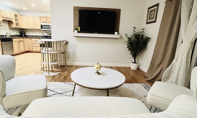 Immerse yourself in this elegant two-story 4-bedroom home nestled in Worcester's vibrant heart. Marvel at splendid minimalist style and sweeping city vistas. Every floor features a complete bathroom, and the kitchen is modern and fully equipped. Entertain outdoors with the convenient BBQ grill, and enjoy the ease of four private parking spaces. Designed for group comfort, each bedroom boasts a smart TV and desk—ideal for work and repose. baby court , pet pads and other amenities available on request
