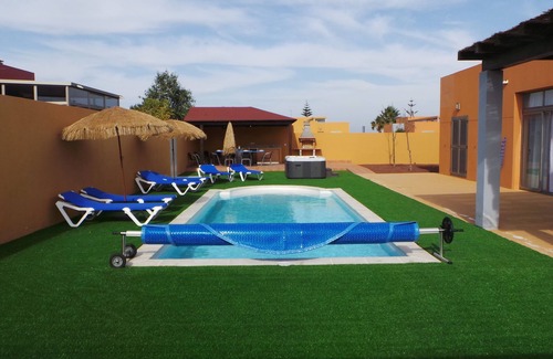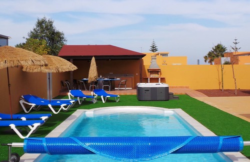 Fabulous and modern villa, equipped to make your vacation unforgettable, located within a golf course, next to a commercial center (1.5 km away) l that has a beautiful walk to the seashore, where Family beaches are accessed. It has a private salt water pool, 9.5 x 3.5 x 1.5 meters heated with ecological solar system; with 6 sun beds and umbrellas; spa-jacuzzi for 4 people; winter gazebo under waterproof pergola with outdoor fridge, kitchen furniture, sink and barbecue. Summer gazebo under heather pergola, and all surrounded by pleasant artificial grass, trees of the island, aromatic and ornamental plants. The kitchen is perfectly equipped. It has a living room of 75 square meters, with dining table for 12 people, two sofas and two armchairs, with TV. Multi-language satellite, DVD player. A bedroom with a 150 x 200 bed with a built-in bathroom; another bedroom with two double beds of 135 x 200; and another with two beds of 90 x 200; Large game room with 12-foot pool table, table game table, satellite TV, XBOX 360.