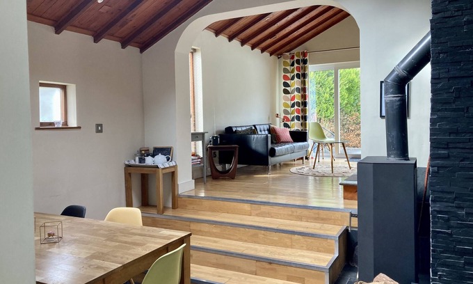 Our sustainably renovated home features open plan, split level living accommodation with wooden vaulted ceilings and generous living space. Complimented with a cosy Scandanavian wood burning stove, large decked veranda and full-length patio doors to fill the house with light and make the most of the incredible views.