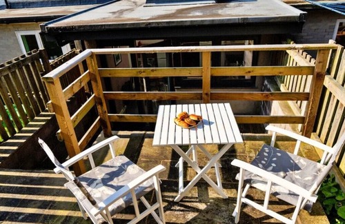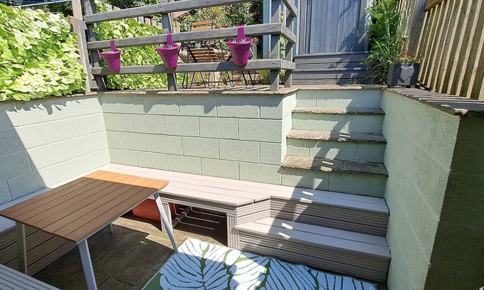 Bwthyn Gweilch, translated into English means Osprey Cottage is located on a quiet terraced street with on street parking. Recently renovated with central heating, Bwthyn Gweilch is a cosy two bedroom cottage, complete with original beams. It has light, bright, airy rooms with a homely feel. As you enter the property you immediately find yourself in the living space where you will find two sofas and TV/DVD with freeview and access to Wifi. The shower room, also situated on the ground floor, comprises walk in shower, basin and toilet. To the back of the property is the kitchen with kettle, toaster, built in oven, hob, washing machine, microwave, fridge/freezer and dishwasher. The dining area within the kitchen comprises a circular table and 4 chairs. The Velux window, large windows and double doors give the kitchen/dining room a lovely spacious feel. There is a cosy two tiered outdoor area. There is a dining area directly outside the back of the cottage, some of which is undercover. Stone steps lead up to the terrace a great place to enjoy a coffee or a glass of wine.