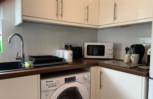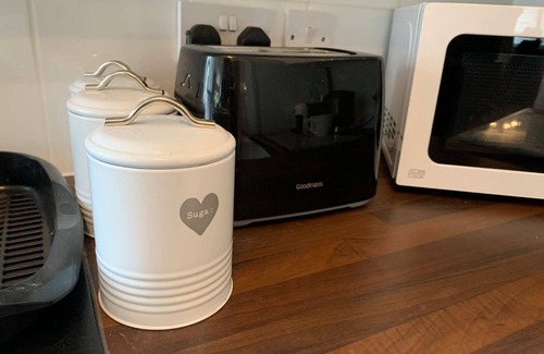 The well-appointed kitchen features ample storage space and modern appliances including a coffee maker. Whether you're a culinary enthusiast or prefer quick meals, our kitchen caters to all your needs. There is a large table where you can dine with friends and family and enjoy your freshly cooked meals. There will be also some basic cleaning supplies and bin bags to get you started.