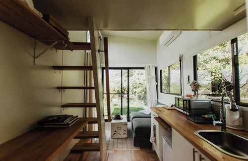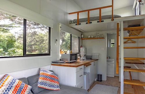 The tiny house has a queen-sized bed in the loft sleeping 2 adults and a couch on the ground floor converting to a double bed sleeping 2 children. It's a cozy 170-square-foot tiny home with easy access to water, split air conditioning, a kitchenette with a portable cooker, cooking utensils, and cutlery. Microwave, mini fridge, and excellent bathroom facilities. These amenities include an eco-friendly compost toilet, hand basin, and shower (gas-heated for hot showers) for your use.