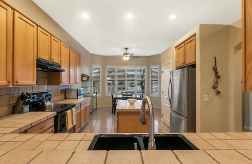 You will enjoy the private backyard with pool (heating available), a spa that is always hot and ready to use, lounge chairs by the pool, new gas BBQ, and a covered patio with a dining table and seating for six. The wrought iron fence provides open views to the adjacent natural desert landscape. The feel of wide open spaces will accent your vacation and make some memorable moments for you to cherish for a long time to come.