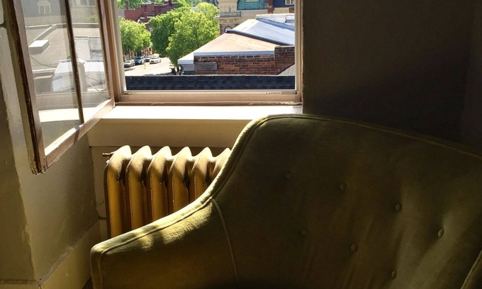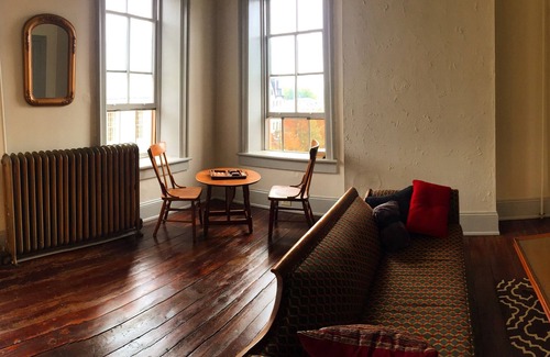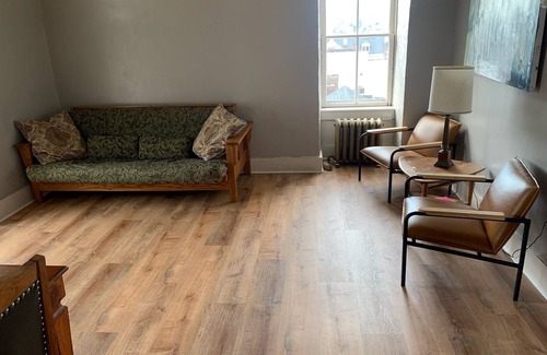Private apt high ceilings, great views, balcony & furnished with antique furniture. Set in Victorian Bellefonte easy walk to bars, cafe's, & parks. 10-15 min drive to State college/ PSU. One full bed, couch, Futon, and queen inflatable mattress. Large living room with futon and vintage couch. Kitchen w/ basic pots, pans, fridge, and small apt stove/oven. Clawfoot bathub in bathroom w/ balcony that connects to large bedroom. High speed wifi included. There is AC in bedroom and a fan in the living room/ kitchen area.