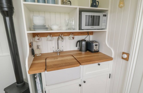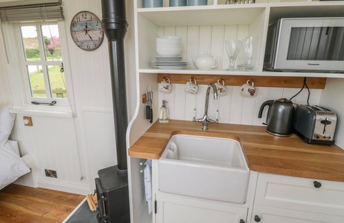 Bellwether is a detached shepherd’s hut situated on the outskirts of the market town of Helmsley. This open-plan, studio-style property houses a double bed, a dining area and a well-equipped kitchen, sleeping up to two people. The interior is completed by a shower room with a walk-in shower, basin and WC. Outside, there is off-road parking for two cars and a garden with a lawn and table and chairs. Bellwether is a superb retreat for couple looking to explore this part of Yorkshire. Please note this property accepts bookings with a minimum of 2 nights.