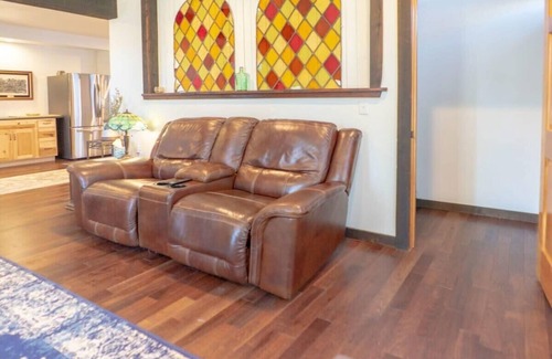 Relax in the sun-filled living area with large sofas and two reclining armchairs offering room for everyone to sit together and watch all your favorite TV shows and movies on the large wall-mounted Smart TV with access to streaming apps.
