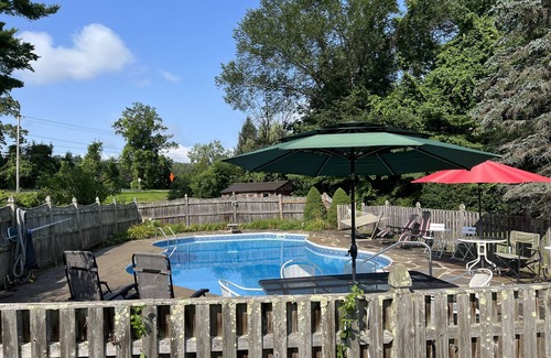 Escape to tranquility at this country home nestled among the picturesque Berkshires of Massachusetts. Located in North Egremont and situated on five acres of land with over 300 feet of river frontage on the Green River and an inground swimming pool. This retreat offers breathtaking views and a calming atmosphere. The property includes a lovely studio unit attached to the owner's home, we call the Green River Suite. It boasts a queen-size bed, private bathroom, pull-out couch, kitchenette/dining area, and in suite washer and dryer. Well behaved pets are welcome and the studio has a ‘doggie’ door that leads into a fenced in yard. The studio also features a patio area with a fire pit and outdoor grill.