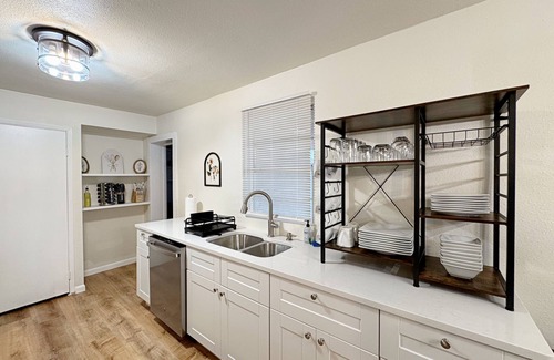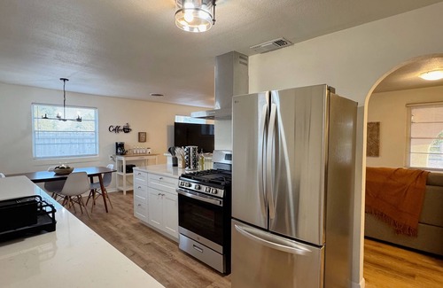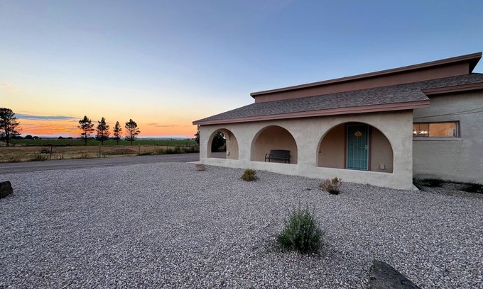 Berrendo Sky Homestead is a remodeled Santa Fe–style retreat on the quiet edge of Roswell, just 4 minutes from Main St. Enjoy breathtaking mountain views you won’t see in town, a fully stocked kitchen with coffee bar, washer/dryer, and bathrooms with all essentials. There are 3 bedrooms plus sofa and futon beds. This home offers peaceful country charm, modern comfort, and quick access to town, making it perfect for a wide range of guests. Some pets may be considered with pet fee.