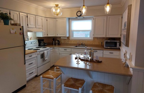 Beautiful coastal style home in the middle of St. Andrews, seconds to Water St. restaurants, shops, & market. Stay 1 month save 20%. Home includes all amenities needed for your stay. 4 large bedrooms: 1 King, 2 Queen and 1 double/single bunk beds. Enjoy our peaceful deck that features a new sectional, propane heater, doggy fence & BBQ. Enjoy Bell Fibre internet & TV, large dining room & cozy living room. Perfect for large families or couples. Special rates upon request.