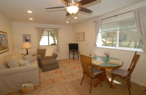 Nightly (min 2), weekly, monthly. The 750sf guest unit (detached from primary residence on 8+ acres) features an open living/dining area, completely equipped galley kitchen, 350sf California King bedroom, Twin sofabed in living room, with fine linens and bathrobes, bathroom with new tile shower, full sized washer/dryer, and woodland view/rose garden patio with grill. The kitchen features a compact fridge/freezer, Breville smart oven, induction cooktop, waffle iron, coffee pot/thermos, coffee bean grinder, French press, teapot/kettle, toaster, microwave, salad spinner, and many other kitchen tools. A tea selection, coffee, sugar, sweetener, butter, cream, salt, pepper, some spices, and olive oil are provided. Hosts will provide additional/special amenities on request.