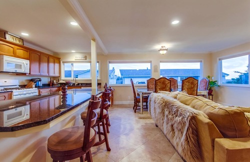Cozy Living Spaces: The living room, kitchen, and great room have ample natural light and breathtaking ocean views. Gather around the kitchen island or relax on the sofa for a movie night.