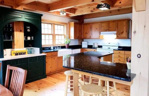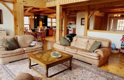 This is our family retreat where we escape from our hectic lives, reconnect with nature and one another. Cell service is available but there is no television or wifi, allowing you to unplug. Spacious, open floor plan with one bedroom and bathroom on the main floor and two bedrooms and a bathroom on the second floor. There is also a loft that has a sofa sleeper that pulls out to a double bed. The unique timber frame construction allows for in floor radiant heat but no central air conditioning. We do have window units in each of the 3 bedrooms only.