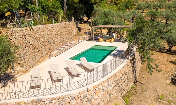 Exclusive villa with a unique mallorquin scent includes all amenities, excellent views and location. Wooden ceilings and colored tiles nicely mix with contemporary and vintage furniture creating thus a rustic as well as modern ambience. The house includes two spacious living rooms as well as a dining room; the house is ideal for groups and families. The show-cooking kitchen and Home-cinema will delight foodies and movie fans alike. All outdoor areas including the pool, rooftop and BBQ are totally equipped for maximum comfort with total privacy. Outside the house perimeter, the guest can fully enjoy the lush green slopes of the Tramuntana Mountains, walk among centenary olive trees and may have the opportunity to come across our furry residents roaming the land peacefully.
