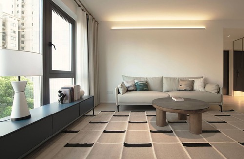 The apartment features approximately 150 square meters of indoor space, complemented by a rare 50-square-meter terrace offering a stunning 180° panoramic view of the Lujiazui skyline. The interior includes 2+1 bedrooms, 2 bathrooms, and separate kitchen, dining, and living areas, ensuring a comfortable and private living experience. The design incorporates warm earth tones, paired with mid-century modern furniture that reflects Shanghai's unique blend of Eastern and Western styles. Whether you're here for business or leisure, this exceptional design and prime location offer an unparalleled Shanghai experience.