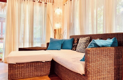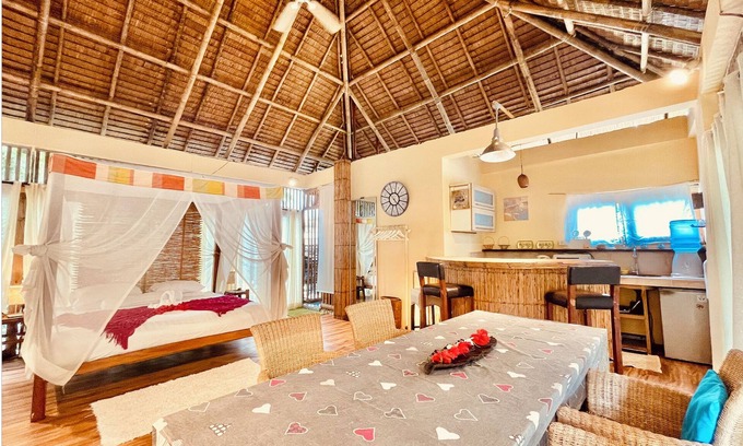You’ll love the island-style décor, with a high native roof, a king-size bed, and a small kitchen to make light meals. Feel the breeze as you relax in this peaceful retreat, surrounded by lush greenery.
