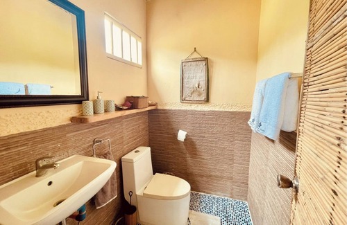 The bathroom offers an open shower with hot water 🌊, a separate toilet area with a sink, and a bidet. Towels are provided for each guest.