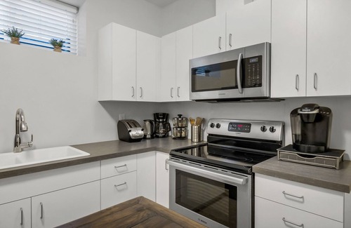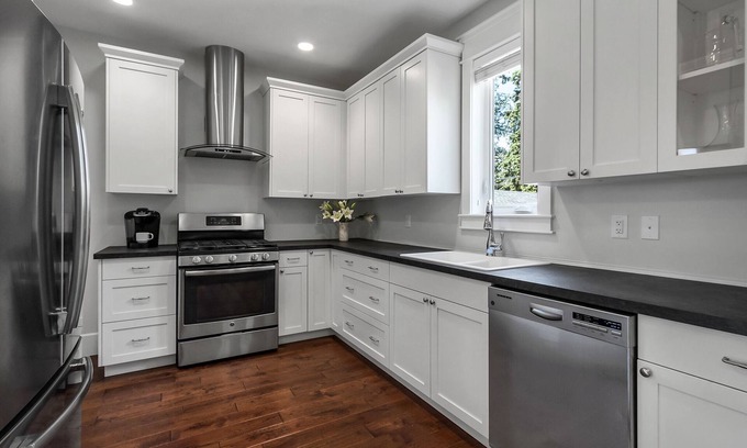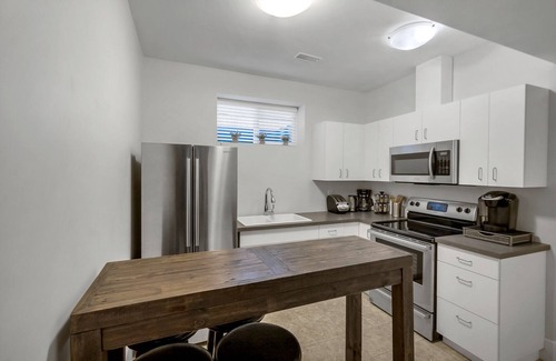 Gorgeous, modern, Victorian 4 bedroom, 4 bathroom home in central mature neighborhood. Experience our medical grade commercial massage chair in front of the electric fireplace. The main house includes a complete suite with separate exterior entrances and can be opened or securely locked via two locked doors and an interior double stairwell with landing.