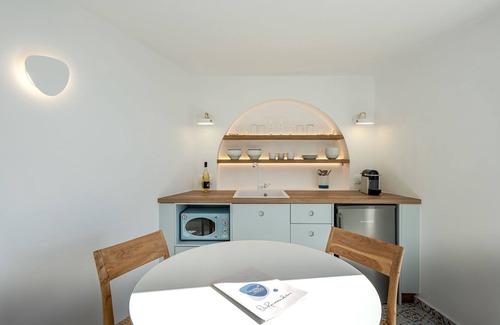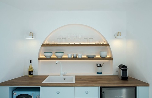 The location is in the center of the village but off the main village path and reached by broad stairs. All of Oia is within an easy walk, including the famous Oia sunset, cafes, restaurants, private chapels, and shops.