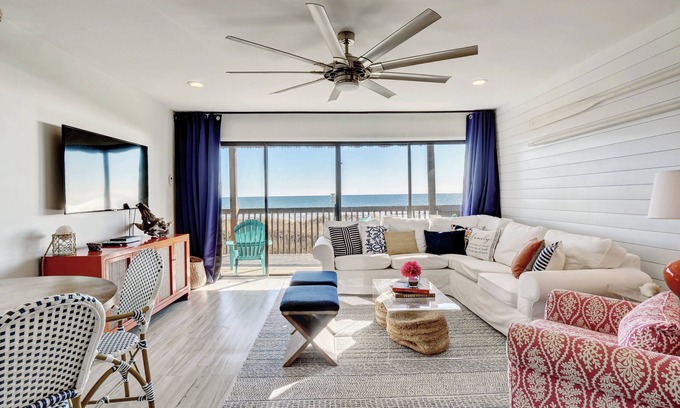 Indulge in the ultimate coastal escape at this beautifully designed oceanfront condo, perfect for families or groups seeking relaxation and fun. With private beach access, a stunning oceanfront pool, and one of the largest decks in Carolina Beach, this retreat offers a luxurious yet comfortable getaway with breathtaking views every step of the way.