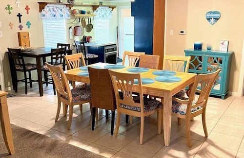 Beautiful 5-bedroom/2-bathroom coastal decorated house sleeps 15 with 2 kings, 1 Queen, 2 twins and 4 futons and LOTS of room for your own air mattresses. 3 living rooms with lots of seating and recliners including a card or domino table, sliding door leads to great deck for a beautiful view of the river. Pool table, foosball table, Xbox, satellite tv, and family games available for entertainment. Full sized washer and dryer downstairs, full commercial kitchen downstairs, smaller kitchen upstairs. Fully stocked with everything you will need. Fridge upstairs and downstairs. Ice machine downstairs kitchen. A brand new roomy fish cleaning table has been built at the back of the house. This is a great multi-family rental!
