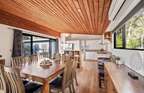 The kitchen is fully equipped with a gas cooktop, electric oven, and Nespresso machine, ensuring you can cook up a feast or enjoy a morning coffee on the deck. Sliding doors lead to this expansive deck, where you can enjoy alfresco dining, a BBQ, and views over the forested landscape. The backyard offers a true nature retreat, complete with a fire pit for cosy nights under the stars, a picnic table for relaxed outdoor hangouts, and an outdoor shower, perfect for rinsing off after a day at the beach.