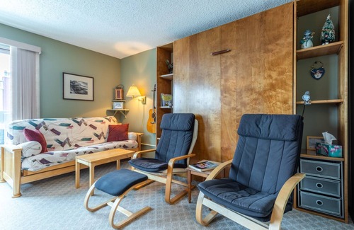 Very private studio in Ptarmigan Inn, only steps away from the Village without all the crowd and noise. Full kitchen, one queen wall-bed and one sofa-bed. Building has a shared 8 person hot tub, cold plunge tub and sauna (open during ski season only). Ski In/Out ( 50m walk to the ski run). Shared laundry facility. Internet and TV included. South facing, lots of light.