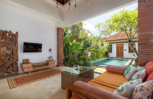Newly built villa 2016, Bijia Villa BR is a combination of 2 x 3BR villas (each with its own private pool) surrounded by a lush tropical garden. Plenty of International and Indonesian eating options nearby.