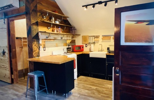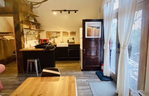 I have created the interior with reclaimed materials and décor that invokes a by gone era. From old wood panels from the late 1800’s with wallpaper from the 1920’s still clinging to them, to the unique sink I crafted from an old door and plumbing pipe. Beautiful light plays upon the 550 square foot loft, & pitched ceiling extends 17 feet high creating a light & expansive space. Huge double doors open onto a large deck where you may sit at the table with a bird’s eye view of the surroundings.
