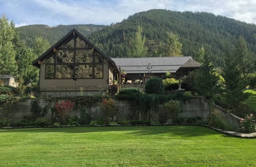 A 1 plus acre paradise on the banks of the Blackfoot River.This is a 2700 Square foot home with 4 bedrooms( 2 Kings, 2 Queens, ). 3 bathrooms( master with separate walk in shower and a full tub). Stainless steel appliances, a double oven range, a microwave, a coffee maker, a toaster, a blender, dishes, etc. and washer and dryer. Huge deck overlooking the river with outdoor furniture including a propane fire pit/table, propane BBQ, this a beautifully landscaped property.