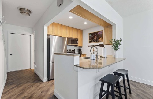 There are 2 bedrooms, both located on the upper floor, and 2 full bathrooms, one on the ground floor and one upstairs. The spacious master bedroom contains a small kitchenette and also has private access to a balcony which overlooks the pool and courtyard, and boasts beautiful views of the ocean. There is a single-car garage available for guests to use, with a washer & dryer, a second refrigerator, a propane grill, and plenty of beach chairs. The kitchen is well-stocked with dishes, pots & pans, a toaster, and a drip coffee maker. There are 3 Smart TVs in the home, one in the living room and one in each bedroom, which all have access to streaming apps.