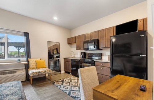 Discover this peaceful Studio gem in West Des Moines. This serene apartment features a cozy living room with a child bed, a soothing king bed in the bedroom, and a relaxing bathtub in the bathroom. With amenities like WiFi, a fitness room, and a washing machine, guests can unwind and recharge during their stay. Our place will help you feel at home while you're traveling in West Des Moines. This unique place has a style all its own. At 550 sqft this studio feels much bigger and exudes positive relaxing energy. Every corner serves a purpose & its ground floor convenience tops it off. Located in the beautiful Jordan Creek West Des Moines & moments from all the best shopping & entertainment. This safe well equipped apartment will surely fit your comfort needs with high end furnishings, YouTubeTV, chef ready kitchens, and a pool and gym that accompanies your confirmed reservation.