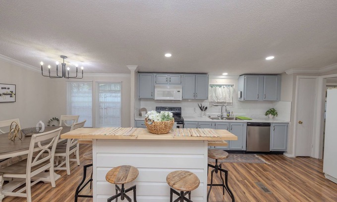 This Newly Remodeled Affordable Family Styled 3-bedroom house on Possum Kingdom Lake is perfect for your escape. The welcoming property features 1 king bed, 1 crib, 1 queen bed, and 2 bunk bed, ensuring a peaceful stay for all guests. With amenities like WiFi, a washing machine, and heating and cooling, your comfort is guaranteed. The 2 bathrooms offer both a bathtub and shower for your convenience. Book now and enjoy everything this quaint house has to offer. The home features a large gourmet stye kitchen with most all cooking amenities. Or relax in comfortable chairs and sofa enjoy large wifi tv. Front porch looks across the road from wooded land and down the road short walk to the waters edge. Large bedrooms with very comfortable beds. Outside features a relaxing hot tub for 6, or maybe its smores over the fire pit wood always provided kick back in the Adirondak chairs watch the moon or stars. Also offer bbq grill, black stone flat top, smoker. Outdoor corn hole set and mood lighted yard for that night time entertainment. Just as you turn off 2353 onto M Anthony Loop there will be a couple sub-standard homes 2-3 of them the rest of m Anthony is developing with newer homes and very clean all the way to the waters edge at the water there is a boat ramp and a beech area to the right ,north m Anthony continues for a couple miles with all water front properties great walking area from water north down m Anthony. Most area attractions are within 12 minutes drive time with several restaurants grocery stores cliffs resort sandy beech public swim area rocker b. Public fishing guide lives next door boat and jet ski rental about 5 minutes away.