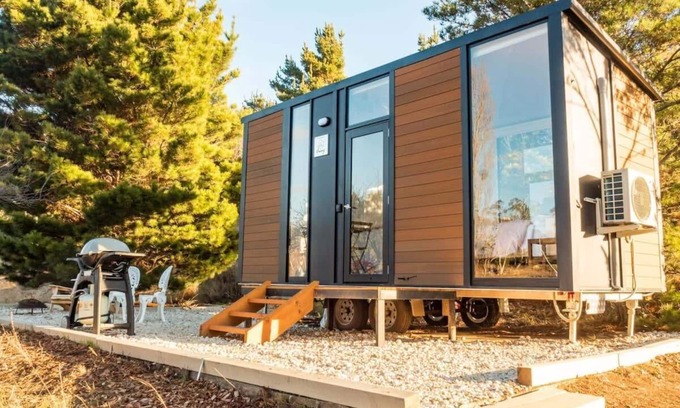A cozy 139-square-foot tiny home with easy access to water, split air conditioning, a kitchenette, cooking equipment, and excellent bathroom facilities (e.g an eco-friendly cassette toilet with a removable waste-holding tank, hand basin, and gas-heated shower).