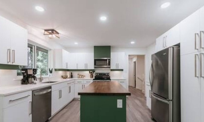 A modern and spacious (2000 sq. ft.) home with 2 bedrooms, 2 bathrooms, and a dedicated workspace (desk and chair) spread generously over two levels. Please note that there is a bedroom and bathroom on each floor.