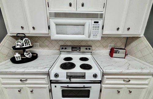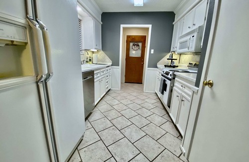 The kitchen is stocked with everything you should need to prepare a meal or enjoy take-out from one of Lubbock's many restaurants. Our vintage stove adds a touch of character to the fully equipped kitchen. The attached dining table will seat 6 guests so that you can enjoy your meals or play a game together.