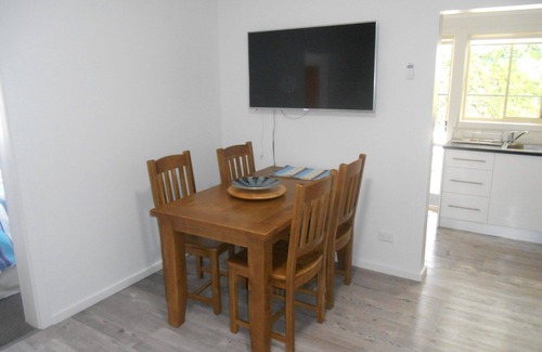 New kitchen with under bench oven with induction cook top, microwave, fridge/freezer, dining table/chairs. Lounge with TV/DVD.